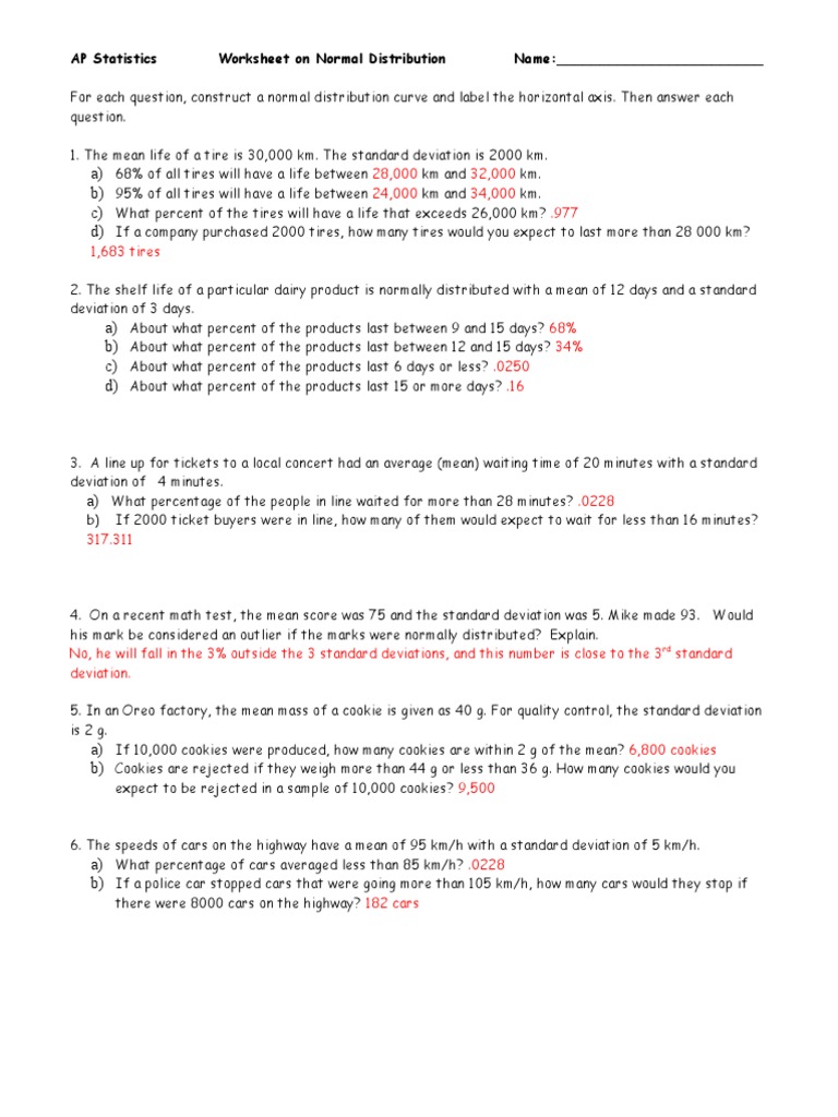 Normal Distribution Worksheet 2 Ans Standard Deviation Mean